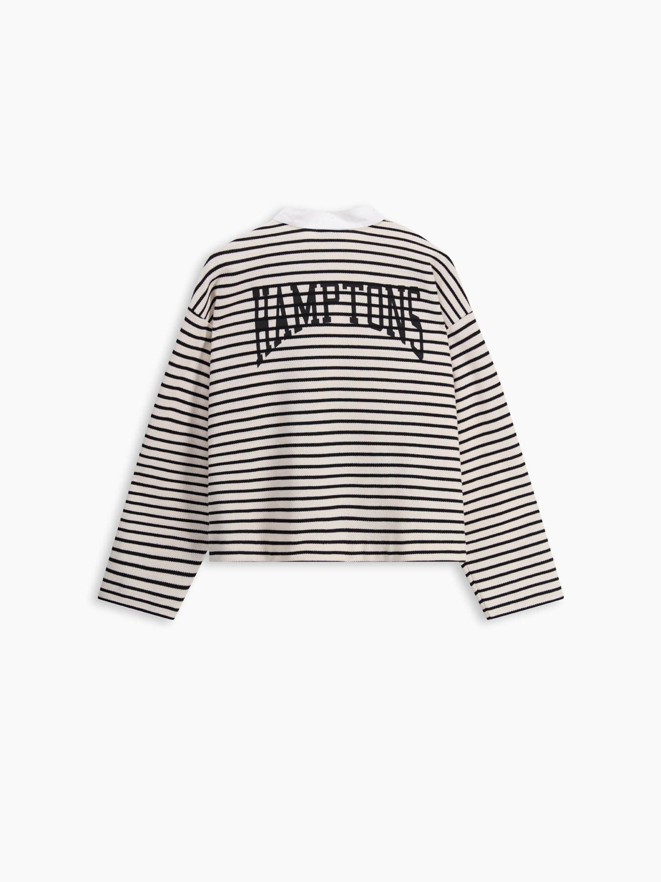 Long-sleeved polo shirt in striped cotton piqué, contrasting cotton poplin collar, back print